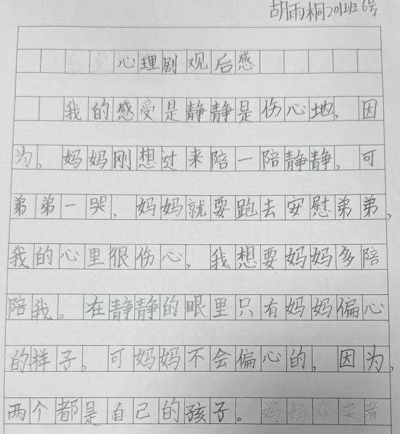 各年级学生撰写的观后感中,充满了真诚的反思:“我以前生气总是摔门,现在知道可以好好说出来”“原来把难过告诉爸爸妈妈,他们会理解我的”。
