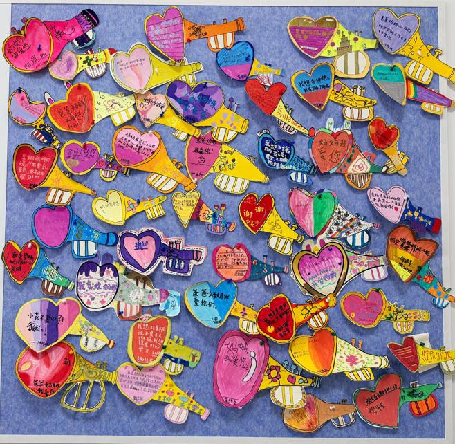 美术课上,孩子们创作了各式各样的“真心喇叭”同款作品——有的喇叭装饰着爱心和彩虹,有的画上了自己和家人手牵手的图案,还有的设计了“情绪调节按钮”。这些作品不仅是艺术创造,更是孩子们内心世界的可视化表达。