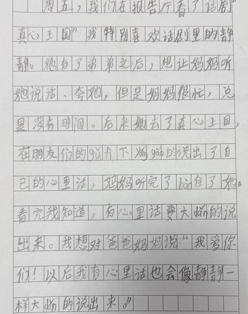 一年级的孩子们被绚丽的舞台和有趣的情节吸引,在老师的引导下初步理解了“说出心里话”的意义;二、三年级学生则能更深入地思考剧中角色面临的困境与选择,许多孩子在观后感中写道:“原来爸爸妈妈也需要听到我们的真心话”“情绪就像天气,有晴有雨都很正常”。